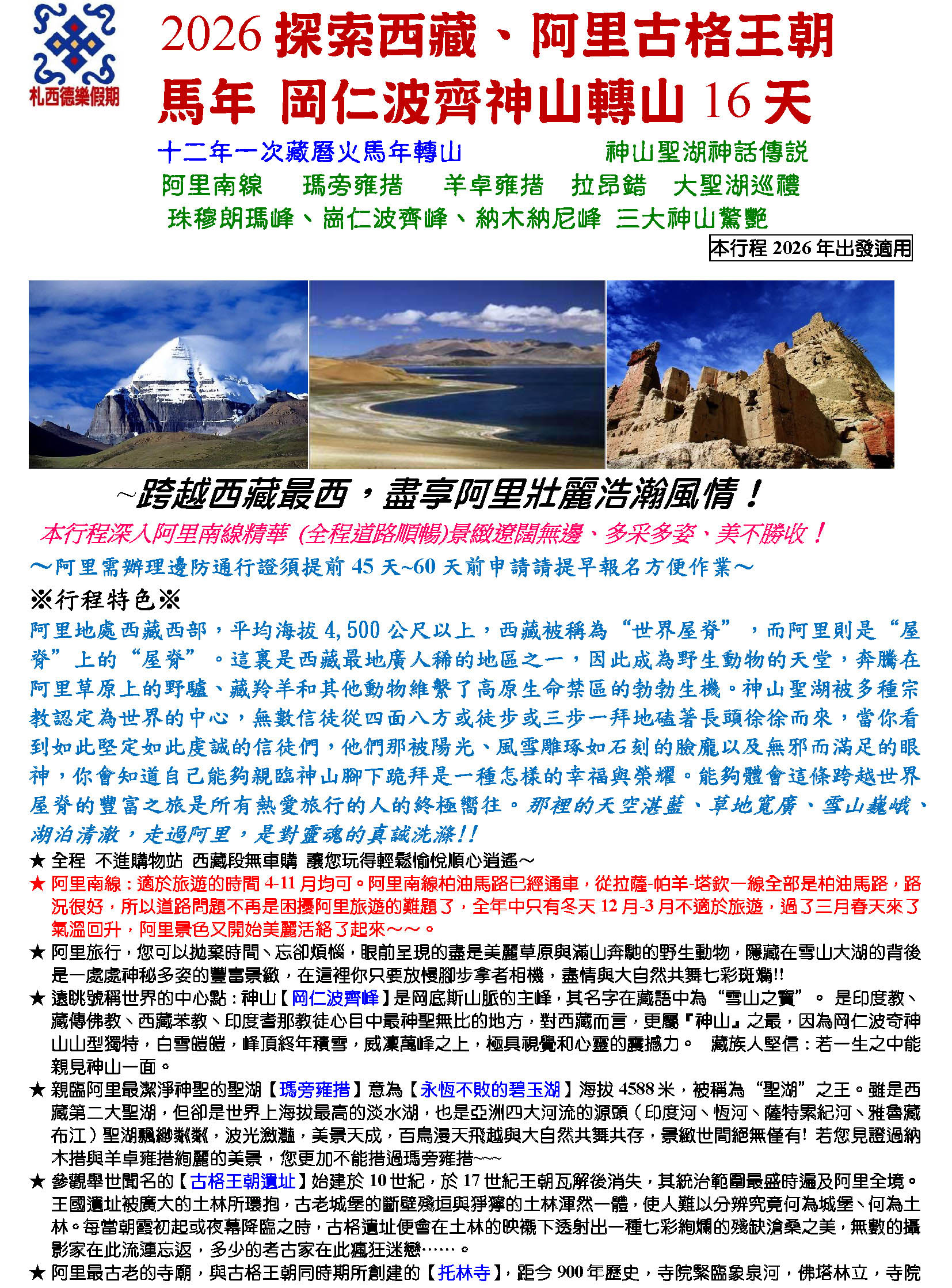 | 2026-06-12 | 2026 探索西藏 岡仁波齊神山 (阿里 古格王朝 )轉山16天 神山聖湖 轉山年 阿里南線 珠穆朗瑪峰、崗仁波齊峰、納木納尼峰 三大神山 售價166900 早鳥現金特惠中 | MORE |