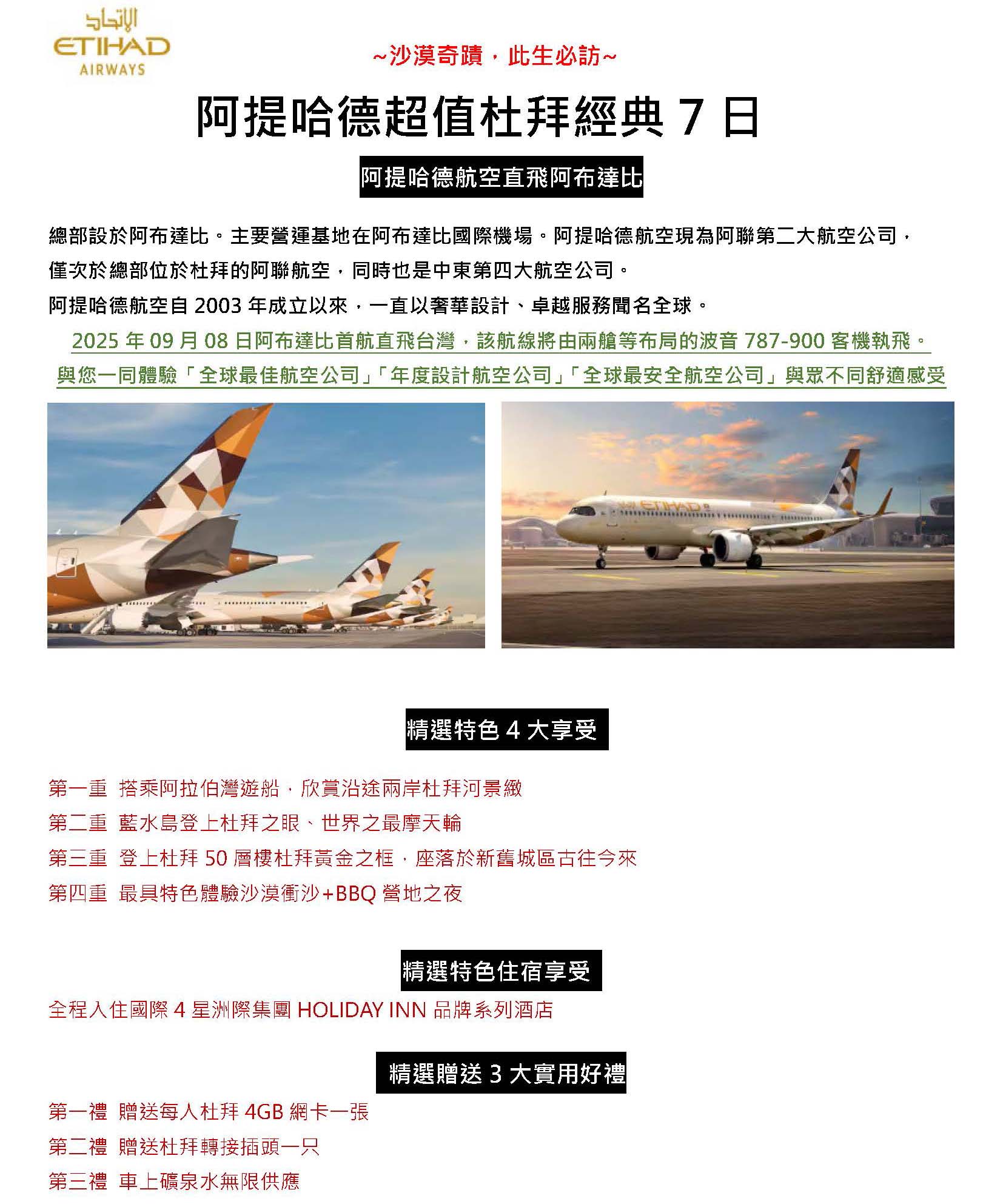 | 2025-11-30 | 超值杜拜 直飛航班 經典7日~僅限11月超值特惠 航空首航~加贈 網卡/轉接頭/杜拜簽證NT4000~11月限定特惠 現金價~ | MORE |